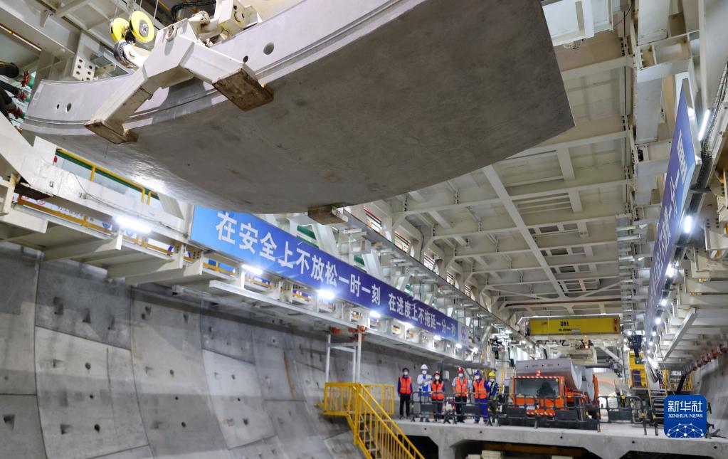 5月28日,在上海軌道交通市域線機場聯絡線工程11標段,工人在操作管片吊機進行施工作業。新華社記者 方喆 攝
