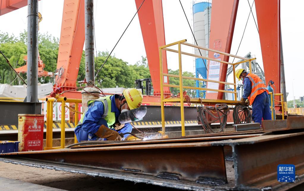 5月28日,在上海軌道交通市域線機場聯絡線工程11標段,工人在進行電焊作業。新華社記者 方喆 攝