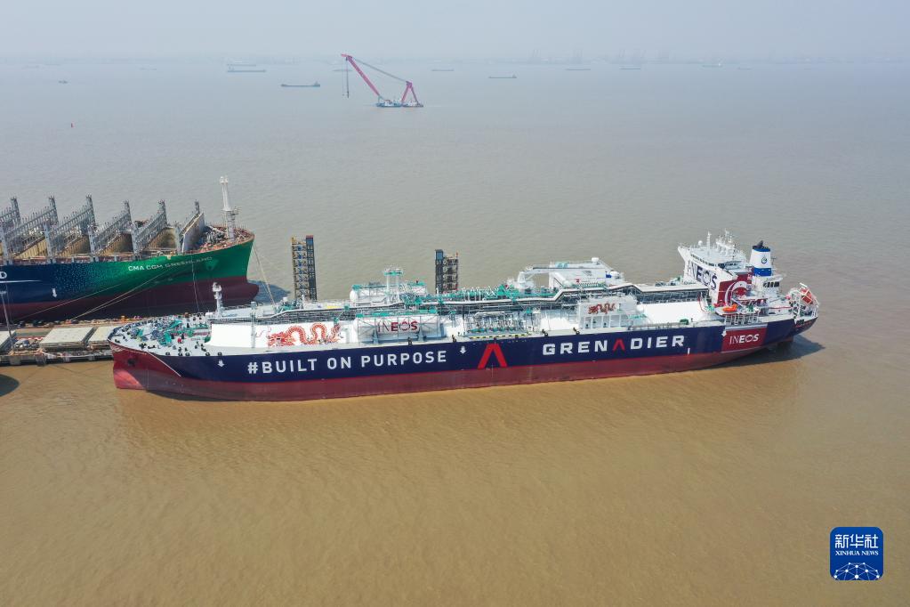 5月16日拍攝的中國船舶集團旗下江南造船建造的99000立方米B型艙超大型乙烷運輸船H2625船(無人機照片)。新華社記者 丁汀 攝