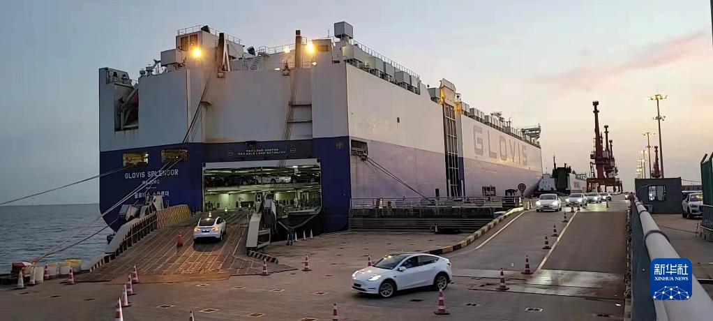 5月11日在上海南港碼頭拍攝的特斯拉電動汽車裝船現場。這是特斯拉上海超級工廠復工復產后首批次整船出口。新華社發