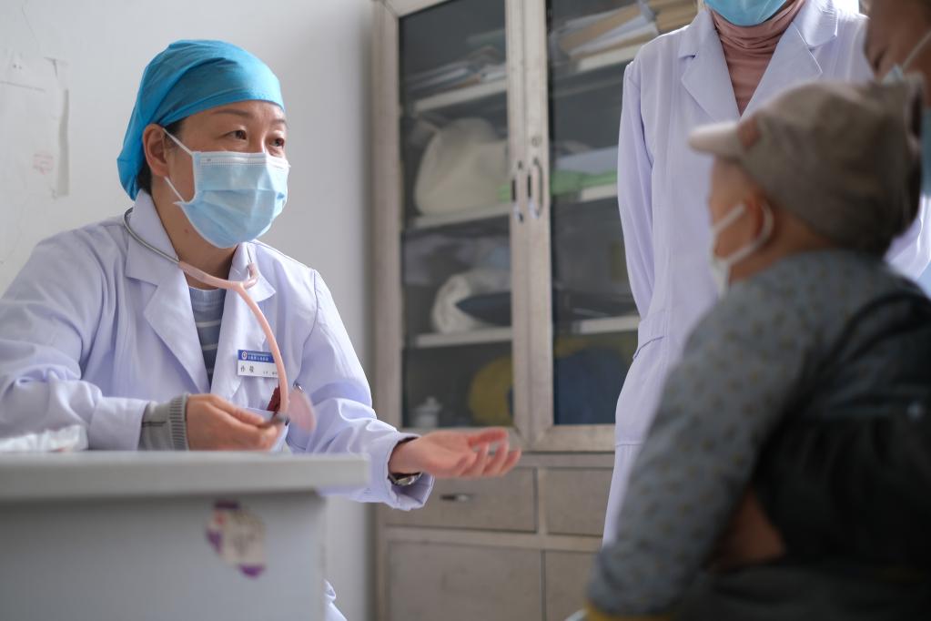 4月25日,青海省婦女兒童醫院醫生、青南支醫隊員孫敬(左一)在青海省玉樹藏族自治州人民醫院兒科門診坐診。(新華社記者韓方方 攝)