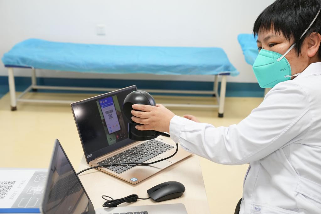 5月22日,在北京市豐臺區盧溝橋社區衛生服務中心,醫務工作者通過視頻連線的方式為預約上門治療的患者掃描電子醫???。(新華社記者鞠煥宗 攝)