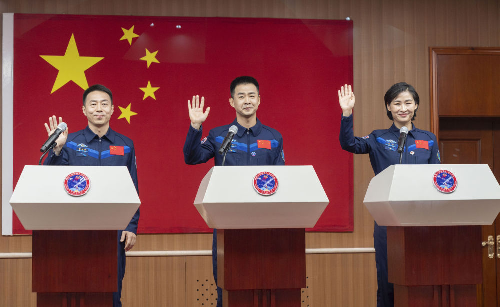 6月4日,執行神舟十四號載人飛行任務的3名乘組航天員陳冬(中)、劉洋(右)、蔡旭哲在酒泉衛星發射中心問天閣與媒體記者集體見面,并回答記者提問。