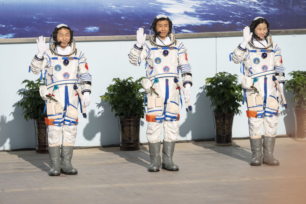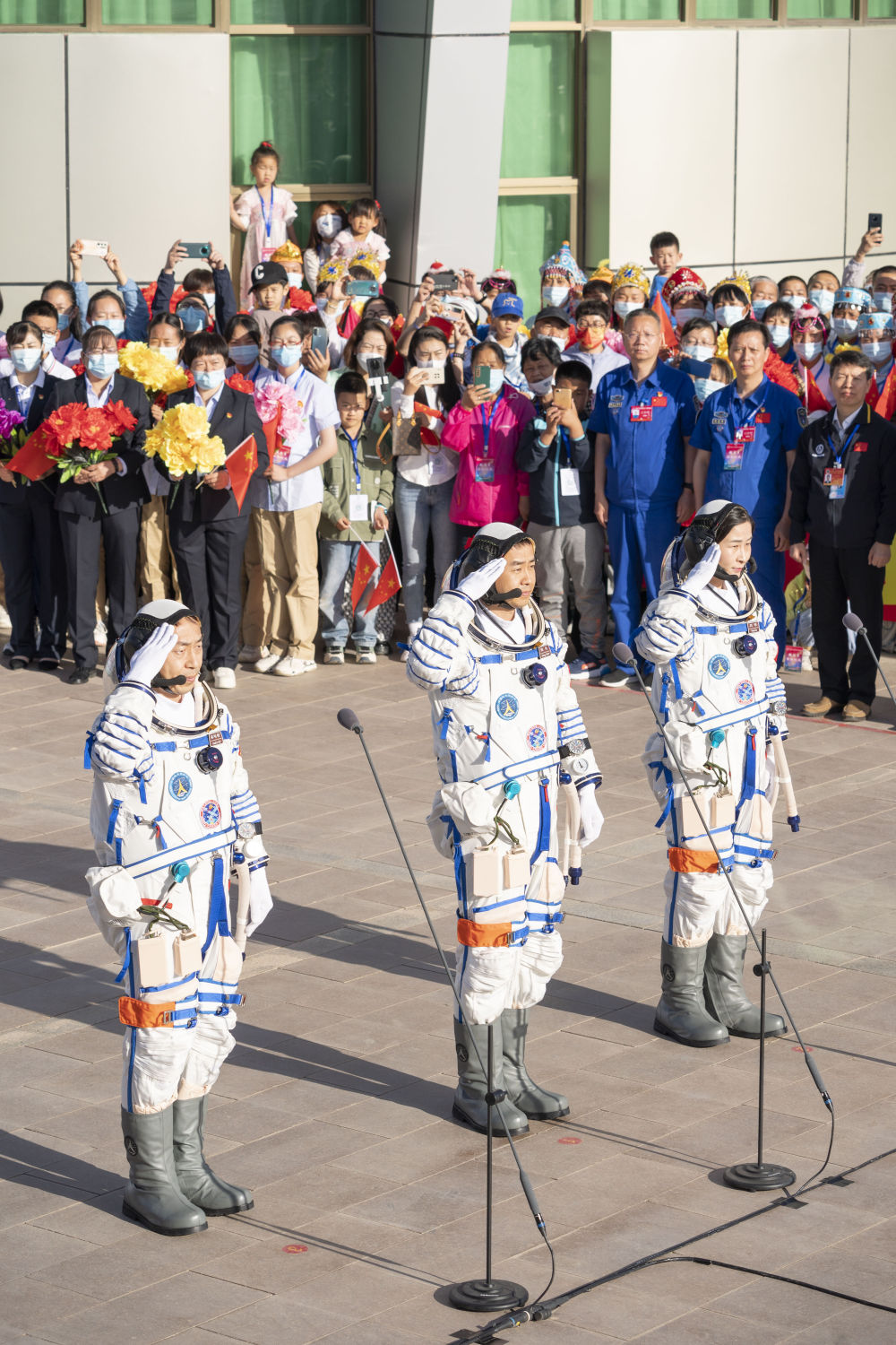 6月5日,神舟十四號載人飛行任務航天員乘組出征儀式在酒泉衛星發射中心問天閣廣場舉行。陳冬(中)、劉洋(右)、蔡旭哲即將開啟為期6個月的飛行任務。
