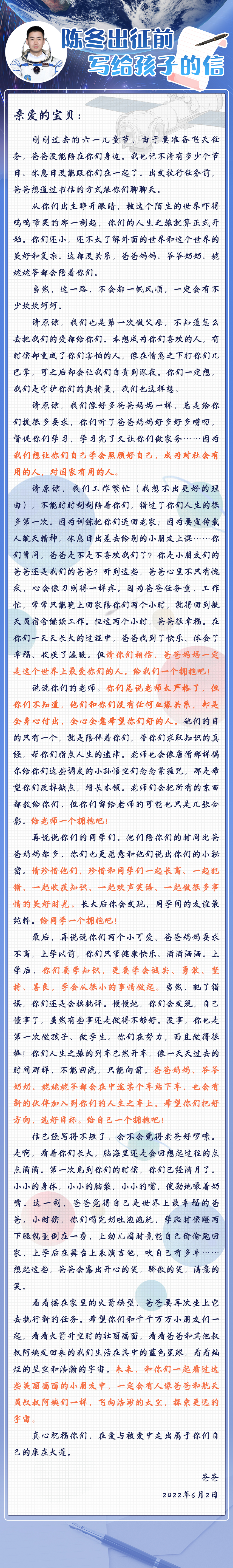 成為航天員后,陳冬在多次采訪中提到過這件事,他非常感謝老師的引導。在給孩子的這封信中,陳冬也流露出對老師的感激,“他們(老師)和你們沒有任何血緣關系,卻是全身心付出,全心全意希望你們好的人”。
