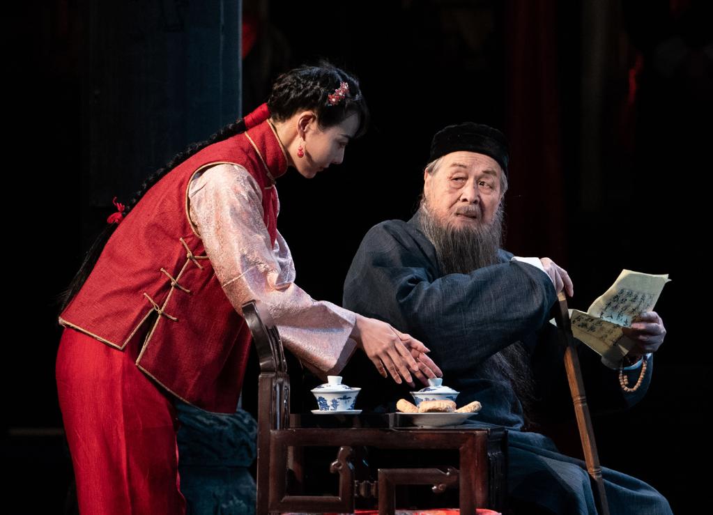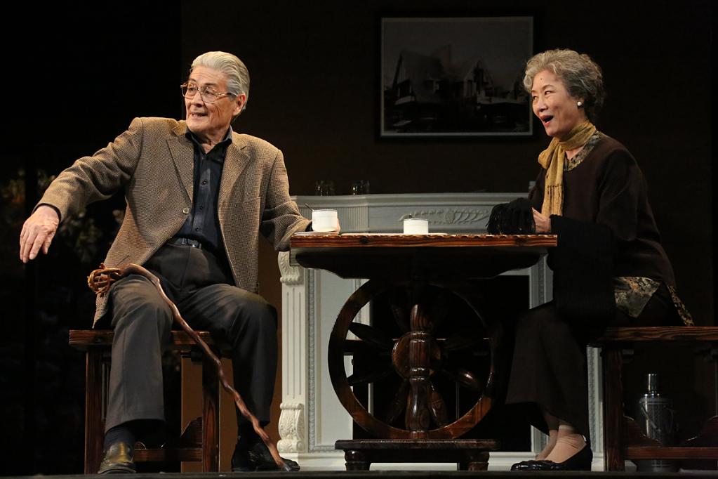 2012年9月14日,老藝術家藍天野(左)和呂中(右)在《甲子園》的演出中。當日,北京人藝年度原創大戲《甲子園》在北京首都劇場首演。新華社記者唐師曾 攝