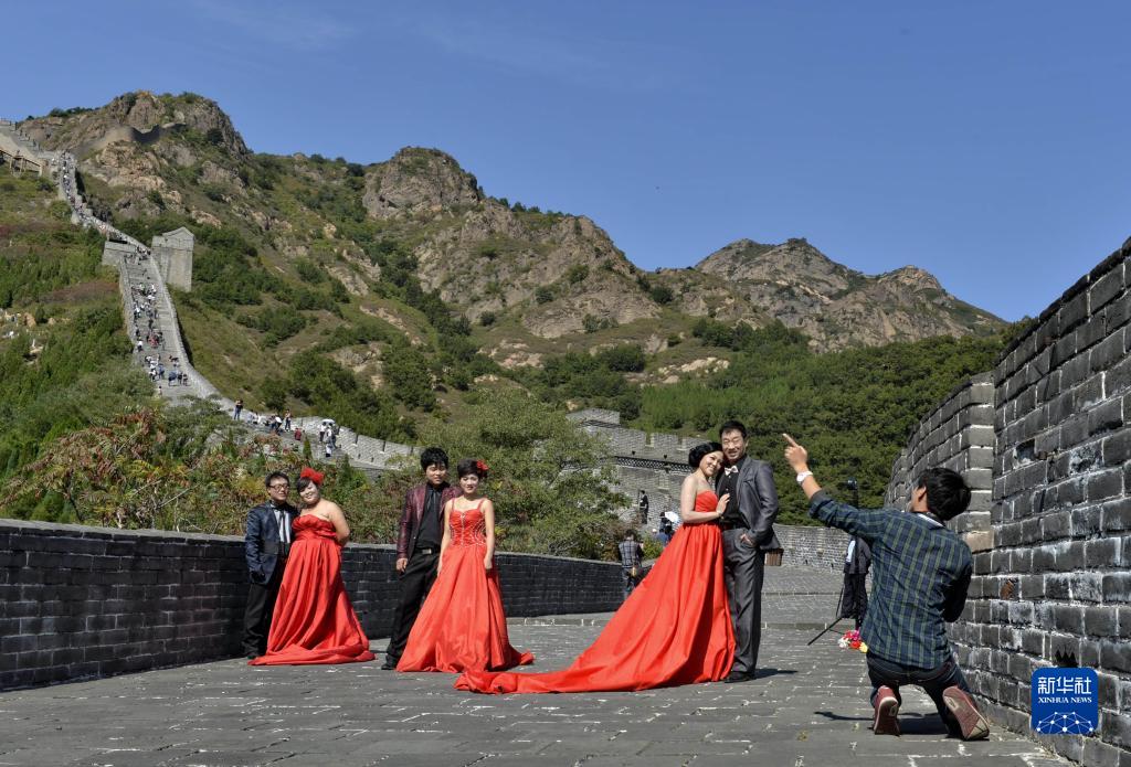 新人在山海關角山長城拍照(2012年10月5日攝)。 新華社記者楊世堯 攝