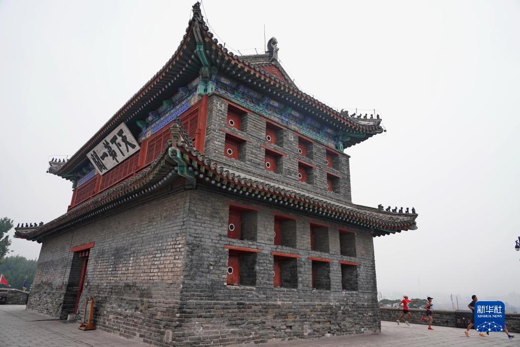 運動員參加2019秦皇島天下第一關·長城國際馬拉松比賽時經過天下第一關城樓(2019年10月20日攝)。 新華社記者楊世堯 攝
