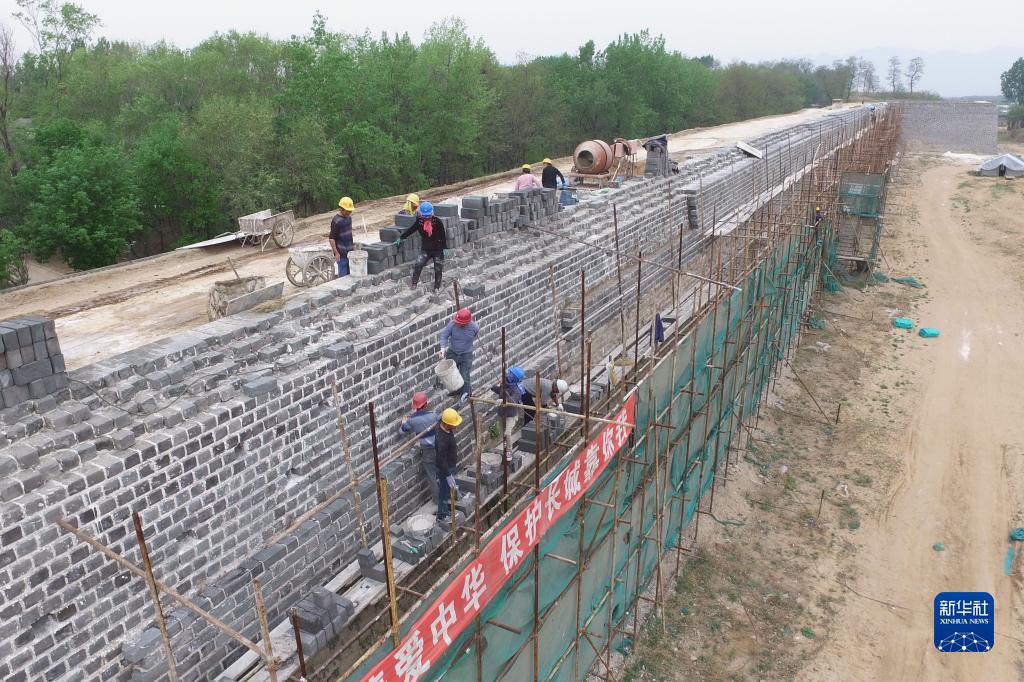 4月26日,工人在山海關長城北翼城修繕工程工地施工。 新華社記者楊世堯 攝