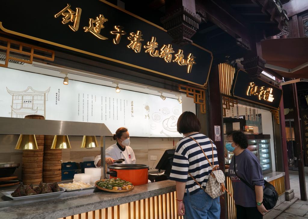 6月3日,上海市民在豫園老字號德興菜館的外帶窗口購買粽子。(新華社記者劉穎 攝)