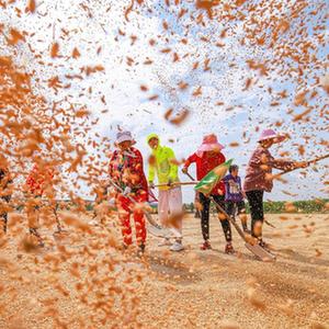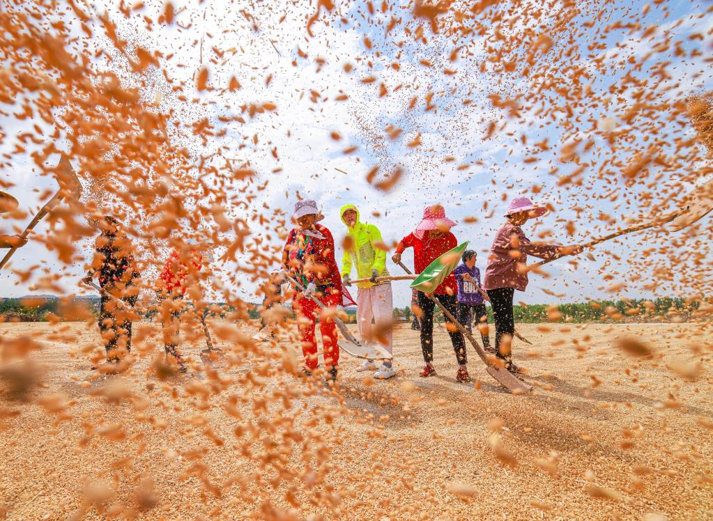 6月13日,在山東省榮成市上莊鎮大李家村晾曬場,村民們在晾曬小麥。(新華社發)