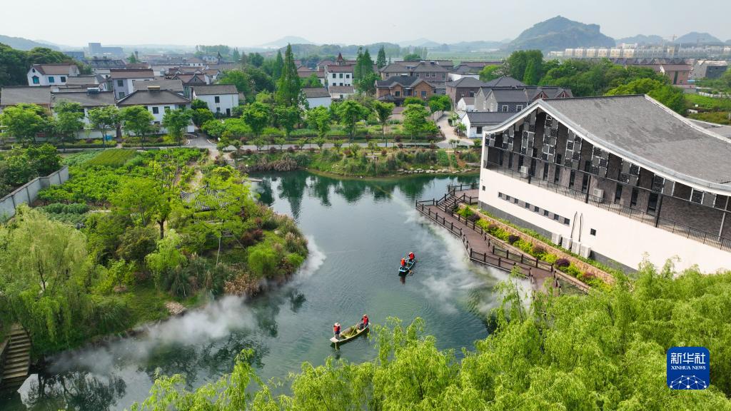 4月12日,在浙江省湖州市德清縣洛舍鎮東衡村,河道保潔員在進行日常保潔(無人機照片)。新華社發(王正 攝)