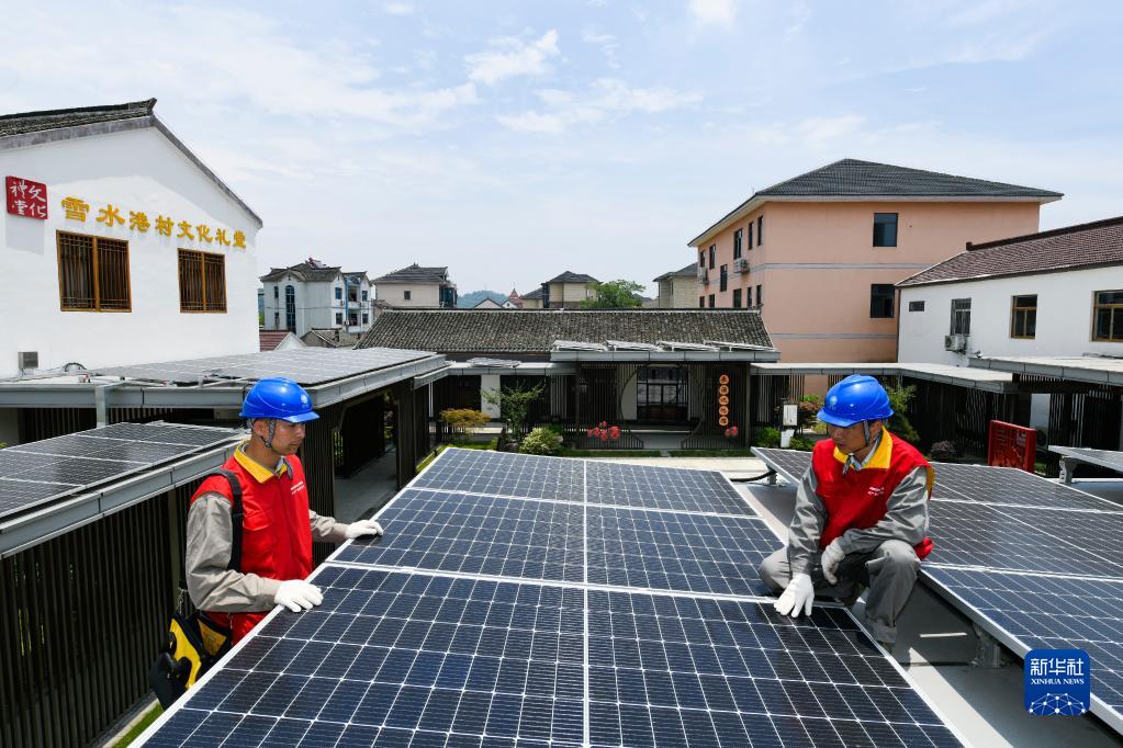 6月9日,電力工人在浙江省嘉興市海鹽縣通元鎮雪水港村文化禮堂的連廊上安裝光伏發電板。新華社發