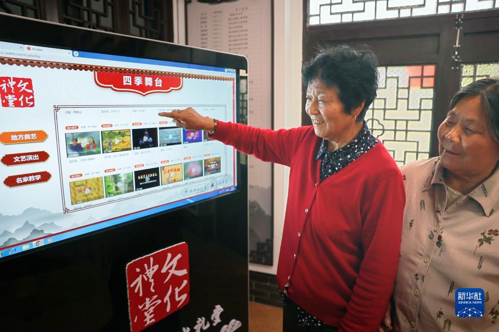 6月13日,在浙江省紹興市越城區馬山街道尚巷村文化禮堂,村民使用智慧觸摸屏觀看戲曲視頻。新華社發(黃葉華 攝)