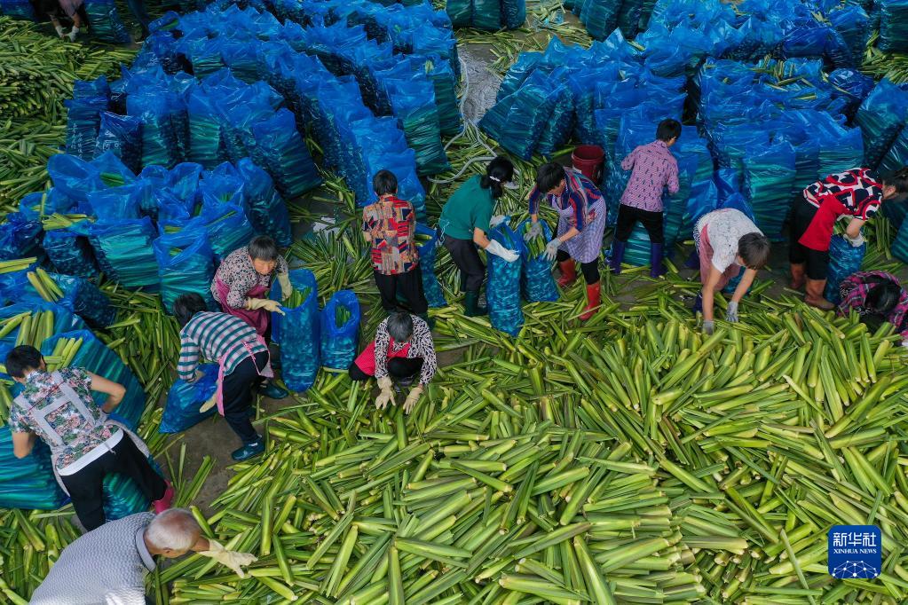 2021年8月25日,在浙江省麗水市景寧畬族自治縣大漈鄉大漈村茭白交易市場,村民將新收割的茭白打包冷藏(無人機照片)。新華社發(李肅人 攝)