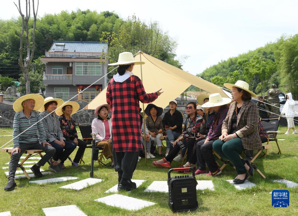 5月17日,在浙江省建德市航川村,“文藝村長”周霞(中)指導村民們進行聲樂練習。該市在各鎮街推行“文藝村長”工作制度,將有意愿的文藝工作者分派到農村開展教學。新華社記者 翁忻旸 攝