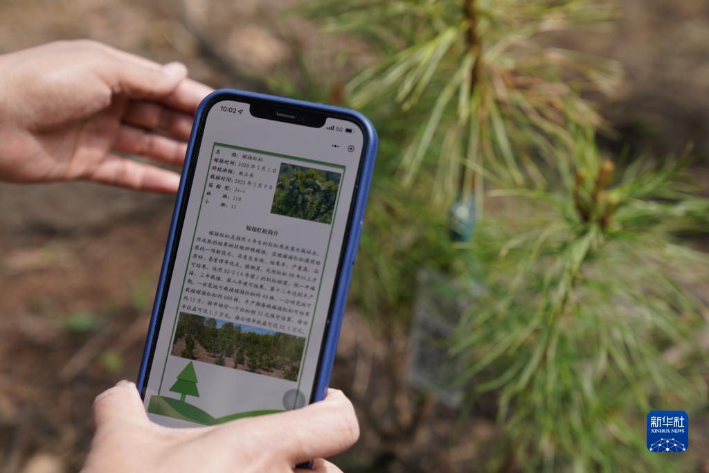 在黑龍江伊春森工集團上甘嶺林業局公司的一處紅松嫁接育苗基地,游客掃碼查看嫁接紅松簡介(5月19日攝)。新華社記者王松攝