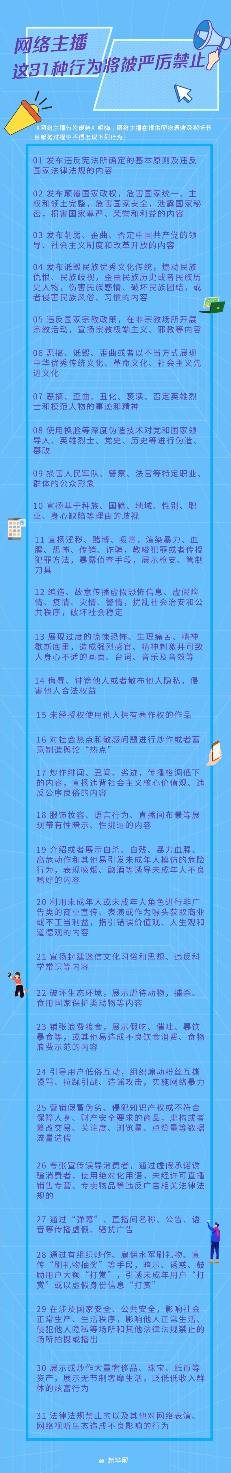 對公眾關心的違法失德藝人還能不能在網上開展直播等相關活動,《網絡主播行為規范》也明確,不得為違法失德藝人提供公開進行文藝表演、發聲出鏡機會,防止轉移陣地復出。(文案/海報:王瑩 )