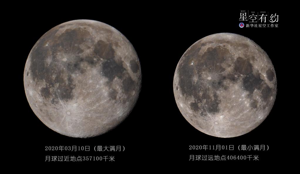 中國天文學會會員、天津市天文學會理事楊婧介紹說,一個公歷年中,通常會有12次或13次滿月。我們知道,月亮繞地球公轉的軌道并不是一個圓形,而是一個橢圓形,因此,月球就會有時離地球近,有時離地球遠,離地球最近處稱為近地點,反之為遠地點。滿月發生時如果月亮正好運行至近地點附近,這時的月亮看起來又大又圓,被稱為“超級月亮”或“超級滿月”;如果滿月發生的時刻與月球位于近地點的時刻最近時,就會出現年度“最大滿月”,反之,則會出現年度“最小滿月”?!白畲鬂M月”和“最小滿月”的視直徑相差大約14%。
