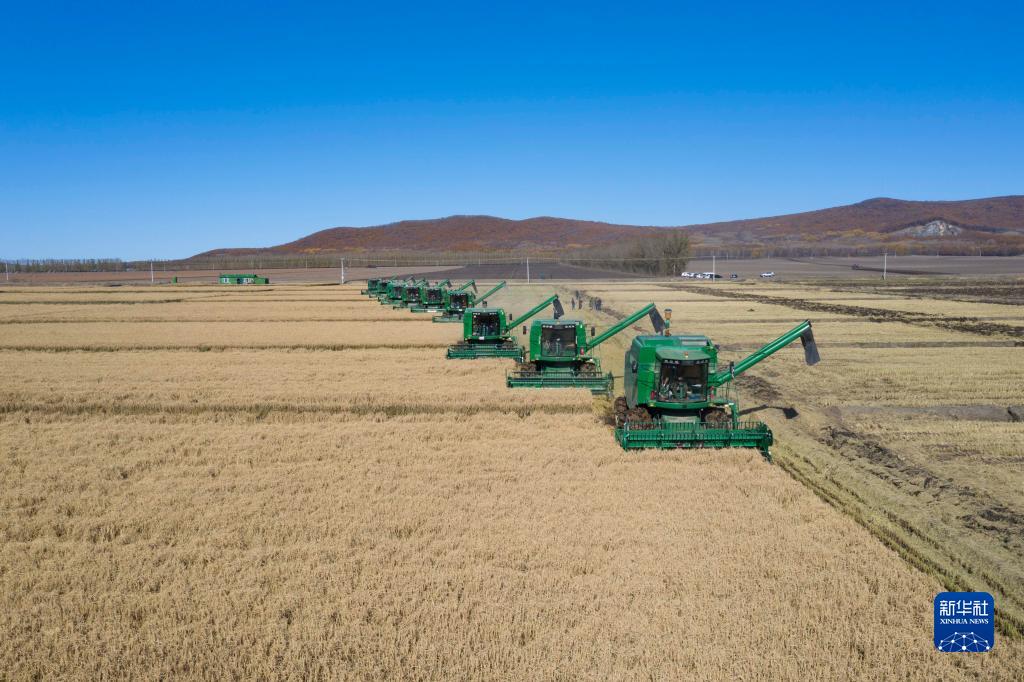 在黑龍江省農墾勤得利農場,種植戶駕駛機械收割水稻(2019年10月12日攝,無人機照片)。新華社發(謝劍飛 攝)