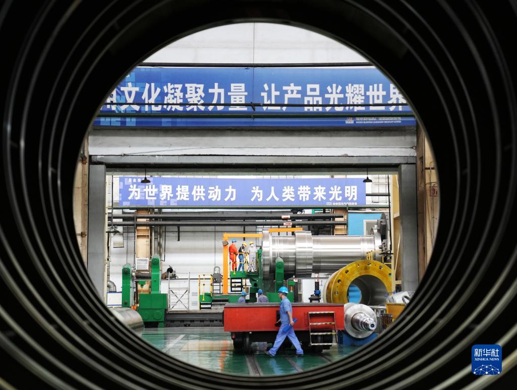 在哈電集團哈爾濱電機廠有限責任公司車間,工人進行生產作業(2022年6月27日攝)。新華社記者 王建威 攝