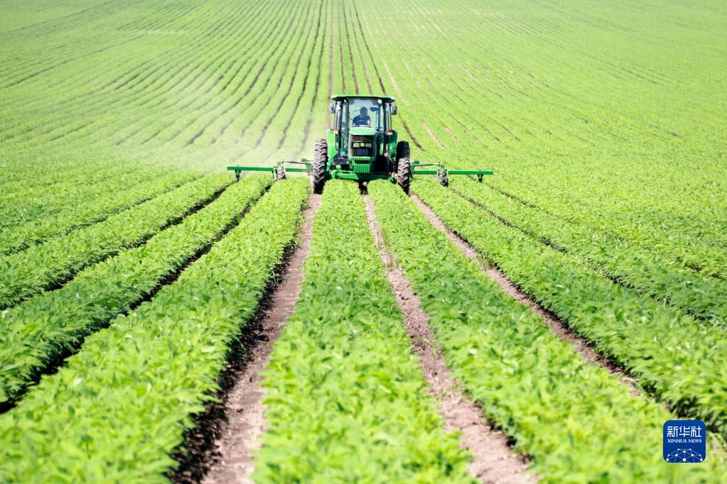 黑龍江北大荒農墾集團五大連池農場有限公司工作人員進行大豆中耕除草作業(2022年6月29日攝)。新華社發(陸文祥 攝)