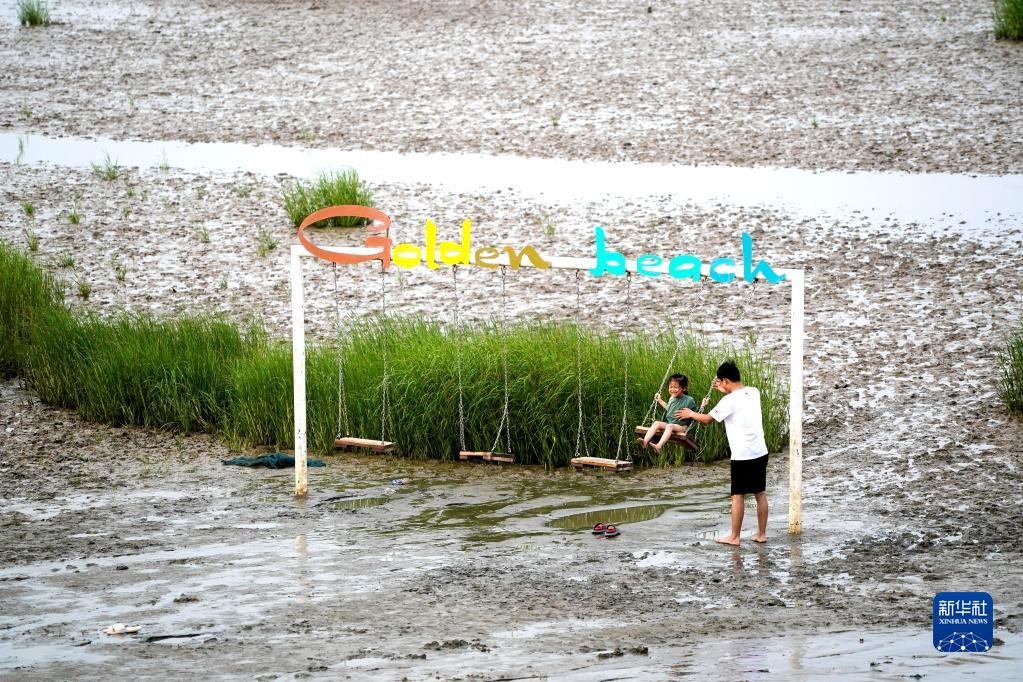 游人在江蘇省啟東市黃金海灘景區內的黃海灘涂上休閑娛樂(2022年7月16日攝)。新華社記者 季春鵬 攝