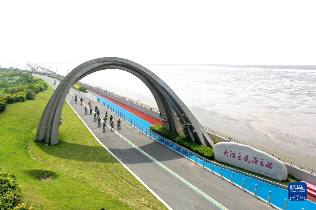 游人在江蘇省啟東市江海文化景觀大道騎行(2022年7月17日攝,無人機照片)。新華社記者 季春鵬 攝