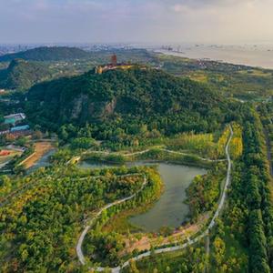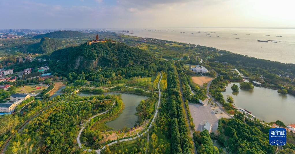 這是江蘇省南通市狼山國家森林公園沿江景色(2021年10月25日攝,無人機照片)。新華社記者 李博 攝
