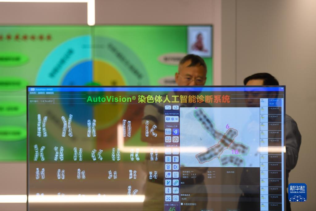 參加中國(杭州)數字·健康小鎮開園儀式的嘉賓在小鎮的成果轉化區了解一套染色體人工智能診斷系統(2020年8月30日攝)。新華社記者 黃宗治 攝