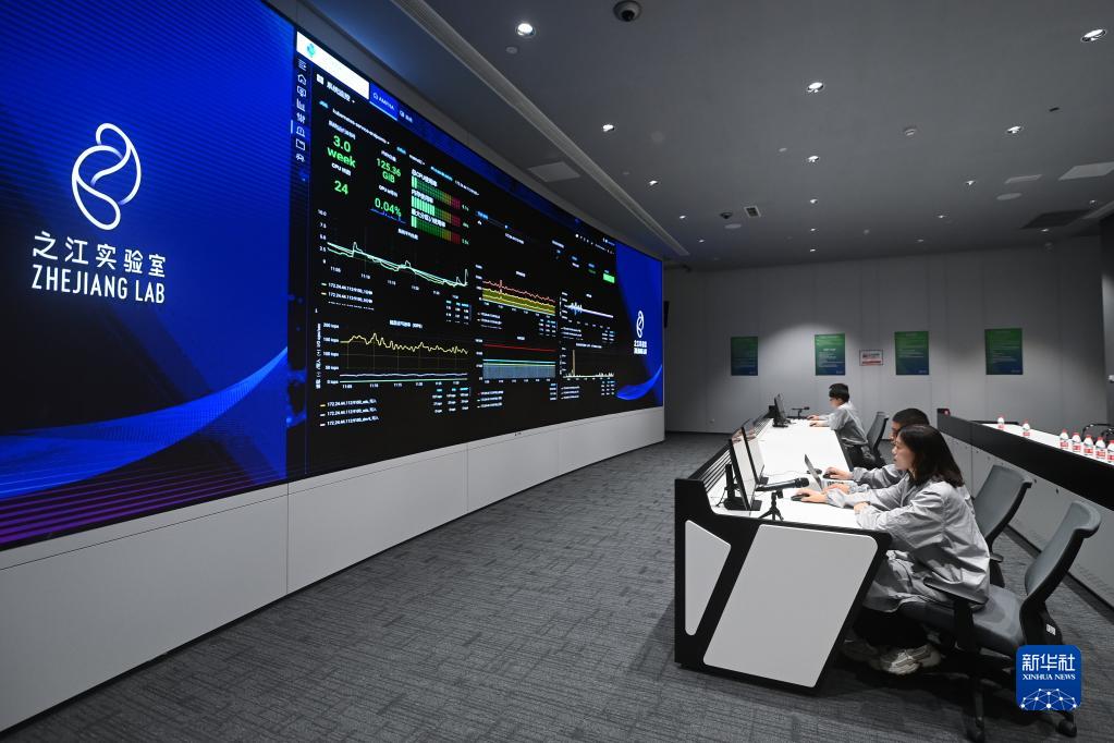 在之江實驗室計算與數據中心,工程師們通過“之江云”系統監測服務器集群的運行狀態(2022年6月23日攝)。新華社記者 黃宗治 攝