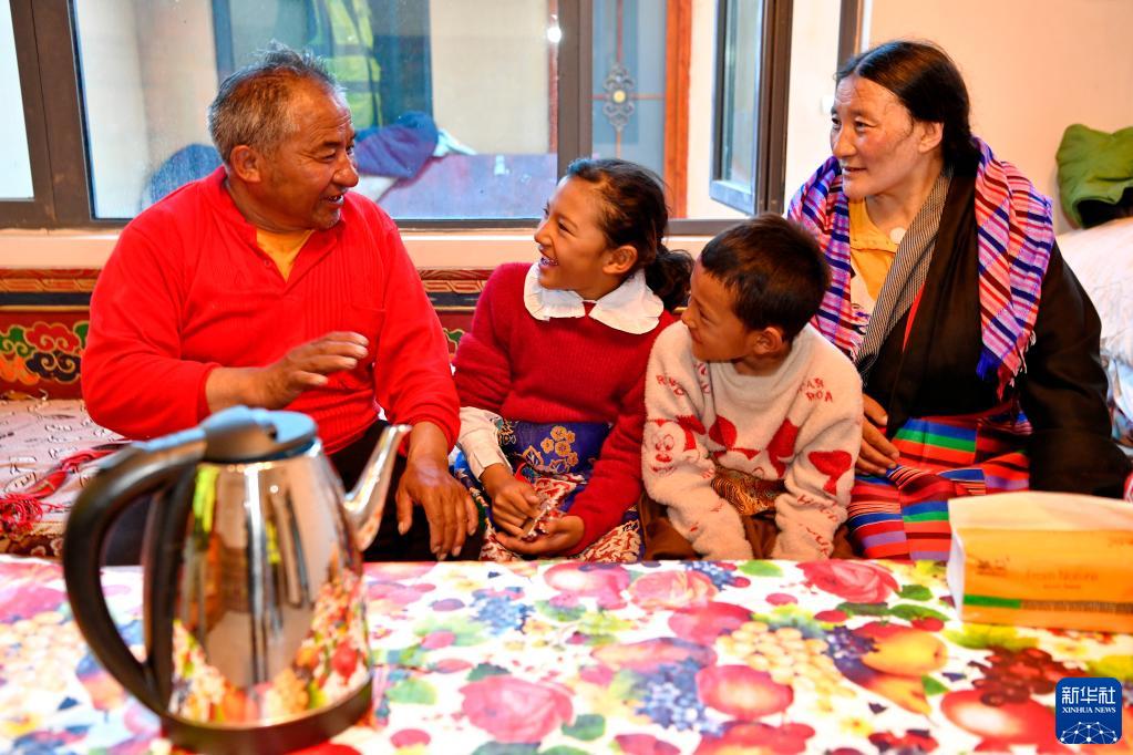 從雙湖縣多瑪鄉搬遷到森布日安置點新居的牧民索朗措加(左一)和妻子查格(右一),與孫女旦珍卓嘎(左二)和孫子歸桑桑旦一起聊天(7月19日攝)。新華社記者 張汝鋒 攝