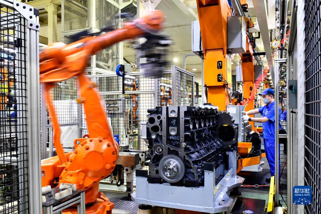 在位于山東濰坊的濰柴集團總裝車間,機器人在流水線上裝配發動機(2021年4月22日攝)。新華社記者 郭緒雷 攝