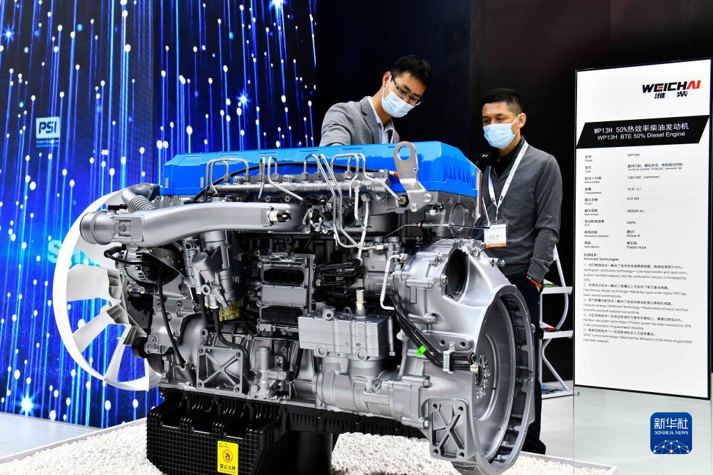 在山東濟南召開的第二屆世界內燃機大會上,濰柴集團展示的高熱效率柴油發動機(2021年4月21日攝)。新華社記者 郭緒雷 攝