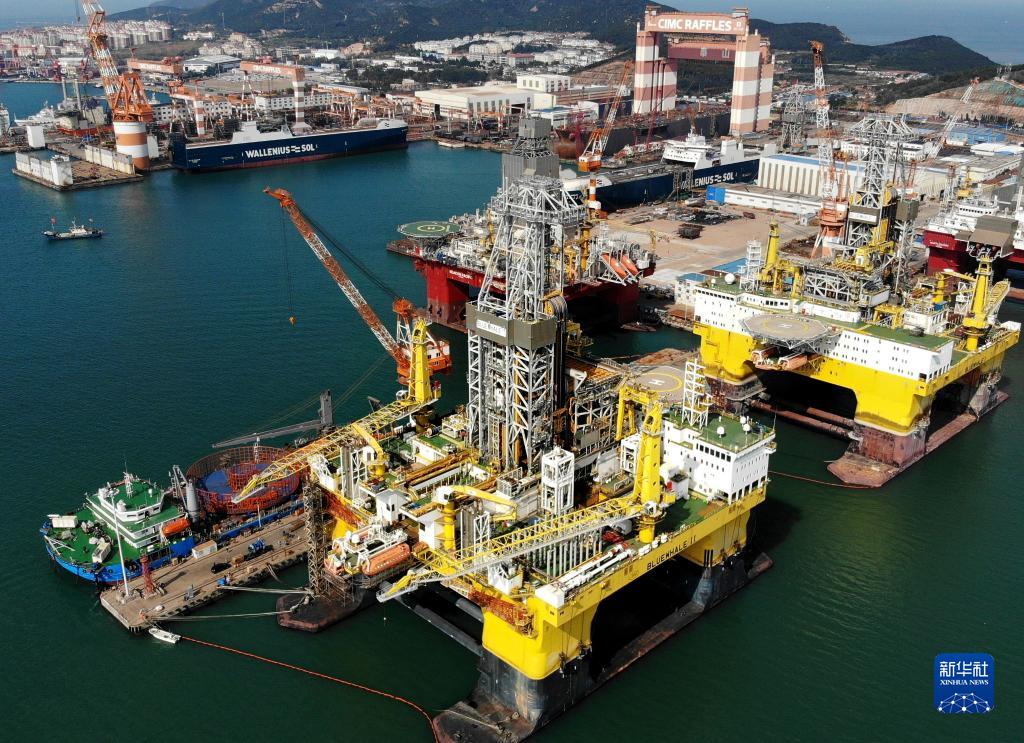 這是“藍鯨1號”(前右)及姊妹平臺“藍鯨2號”(前左)在其生產基地中集來福士海洋工程有限公司煙臺基地進行維護和保養(2021年10月18日攝,無人機照片)。新華社記者 李紫恒 攝