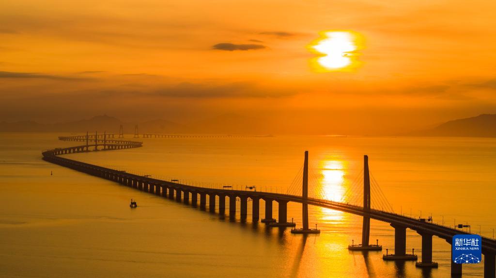 港珠澳大橋海上日出(2019年8月7日攝,無人機照片)。新華社發