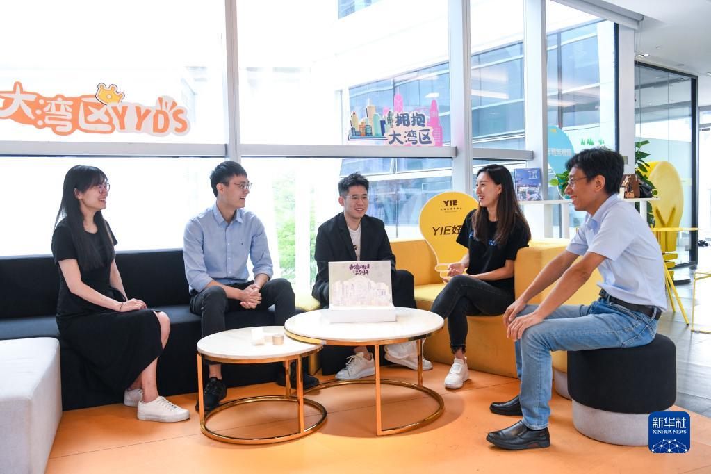 在位于深圳市的前海深港青年夢工廠,香港創業青年們一起交流各自的創業項目(2022年6月20日攝)。新華社記者 梁旭 攝