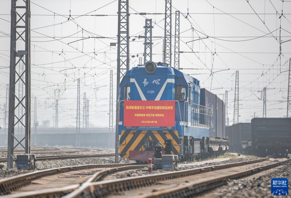 陸海新通道長江-中南半島國際聯運班列(中國果園港-老撾萬象-緬甸仰光)從重慶果園港發出(2022年4月7日攝)。新華社記者 黃偉 攝