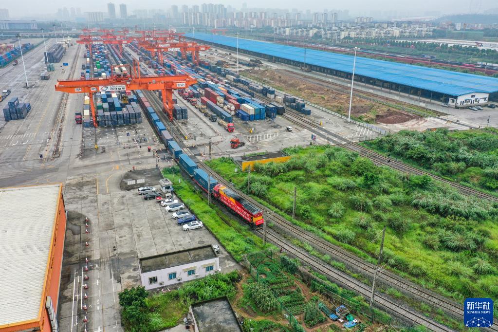 滿載著電子產品、機械零件、日用百貨等貨物的中歐班列(重慶)第10000列列車從重慶團結村中心站駛出(2022年6月23日攝,無人機照片)。新華社記者 黃偉 攝