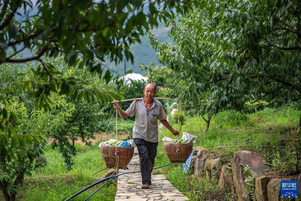 在巫山縣曲尺鄉柑園村,村民張興前在挑運脆李(2022年7月2日攝)。新華社記者 黃偉 攝
