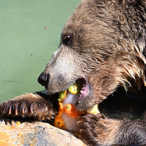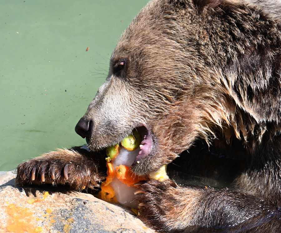 7月19日,在意大利羅馬動物園,一只棕熊吃水果冰棍消暑。