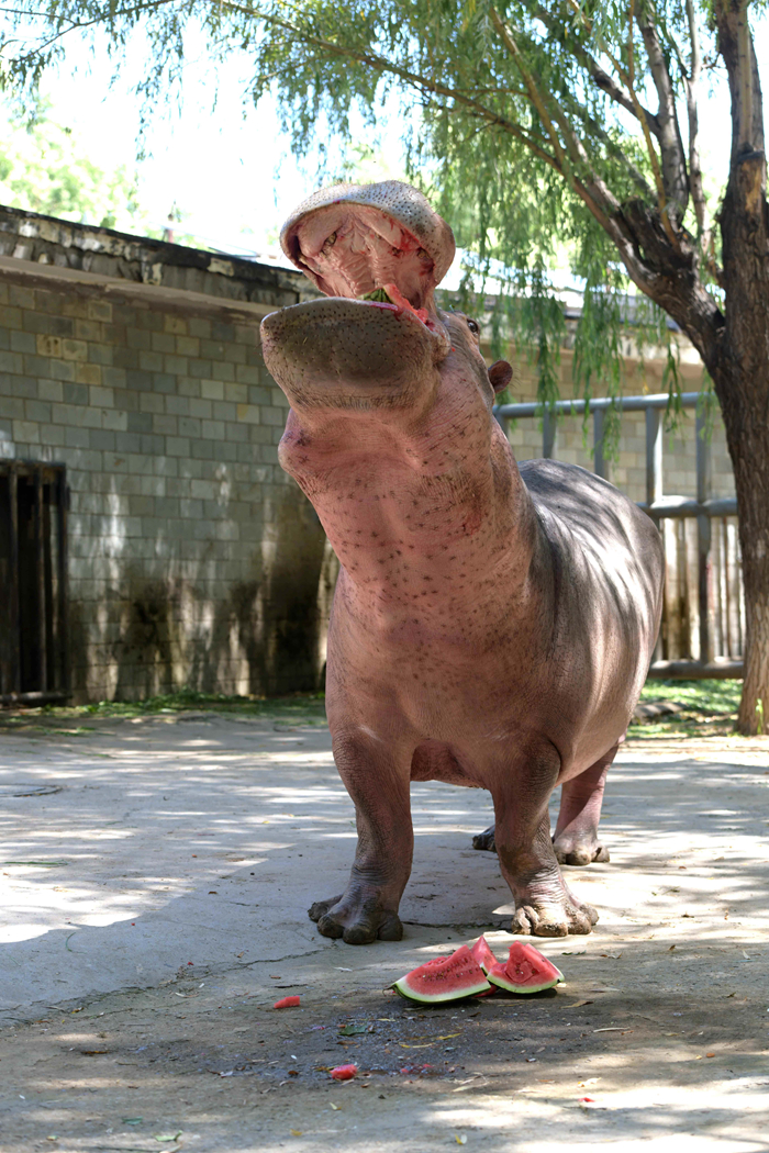 7月24日,石家莊市動物園的河馬在吃西瓜。
