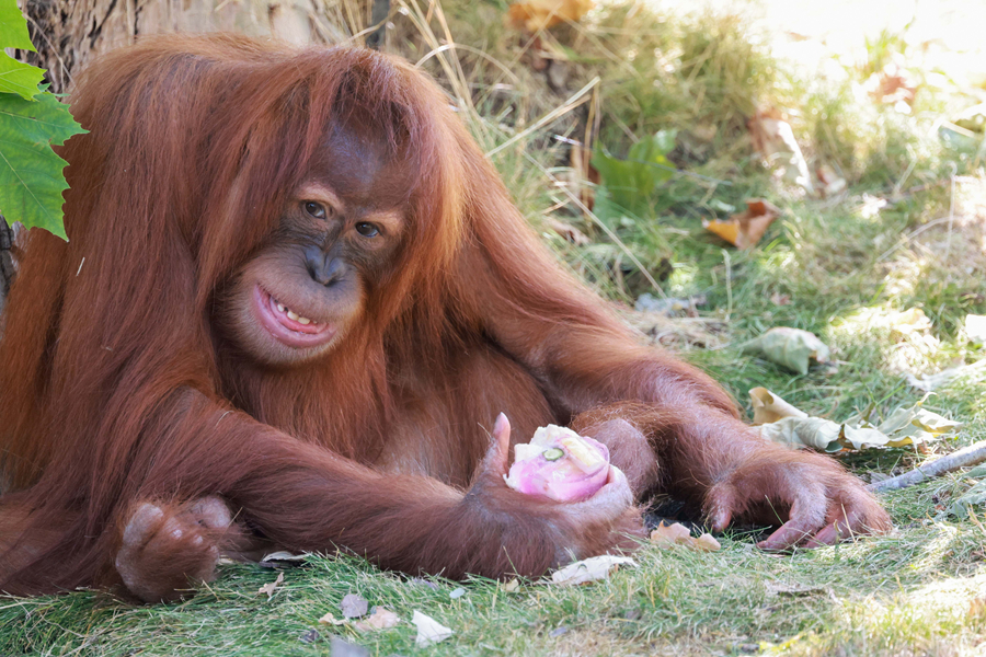 7月18日,在比利時布呂熱萊特市天堂動物園,一只紅毛猩猩享用“冰淇淋”。