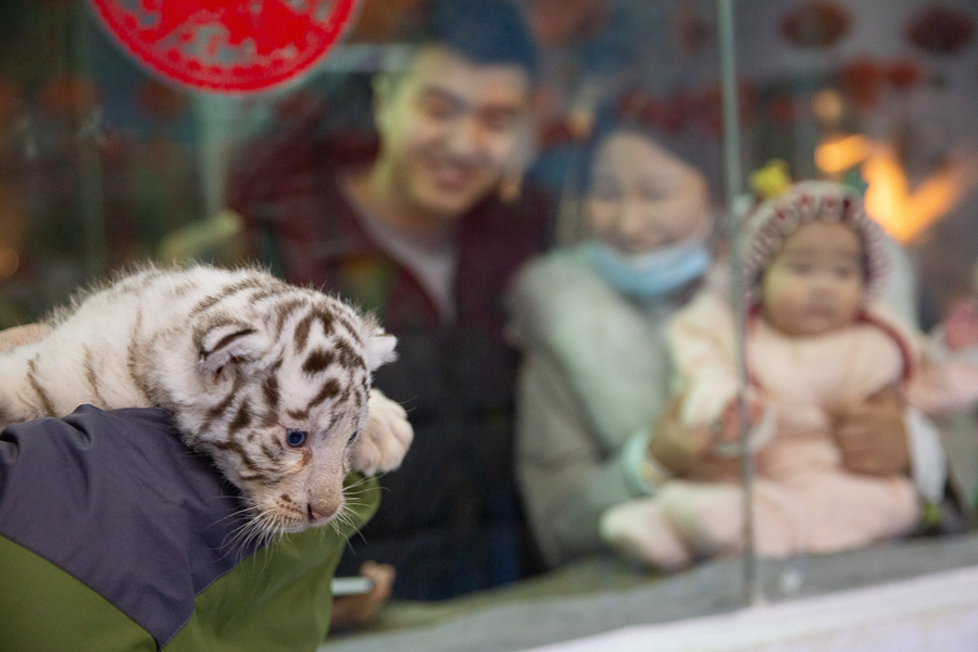 1月26日,在浙江湖州長興太湖龍之夢動物園,保育員抱著白虎寶寶與游人見面。