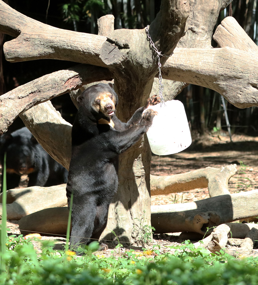 7月22日,黑熊在長隆野生動物世界玩冰塊。
