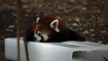 7月15日,上海野生動物園的小熊貓在冰塊上避暑。