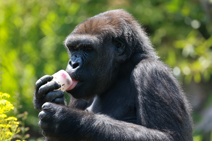 7月18日,在比利時布呂熱萊特市天堂動物園,一只大猩猩享用“冰淇淋”。