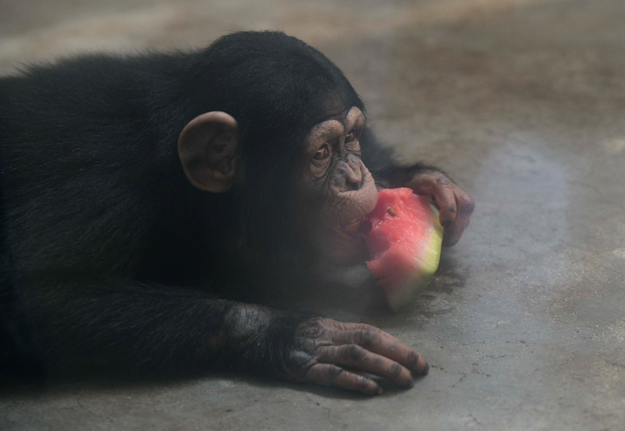 7月24日,石家莊市動物園的猩猩在吃西瓜。