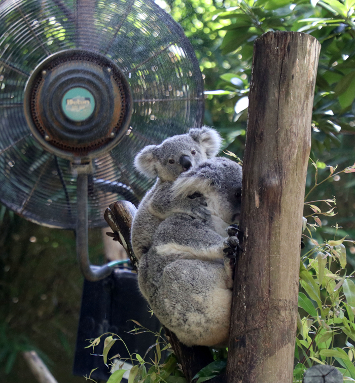 7月22日,在廣州長隆野生動物世界,考拉在風扇前休息。