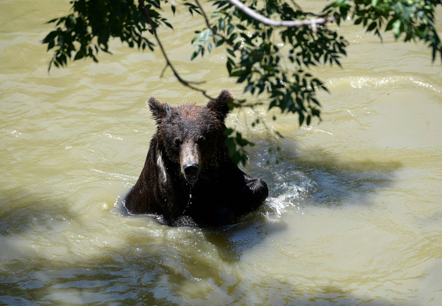 7月24日,石家莊市動物園的棕熊在水中消暑。